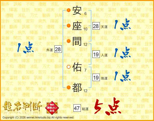 安(6画)座(10画)間(12画) 佑(7画)都(12画)