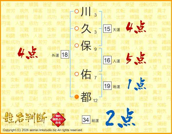 川(3画)久(3画)保(9画) 佑(7画)都(12画)