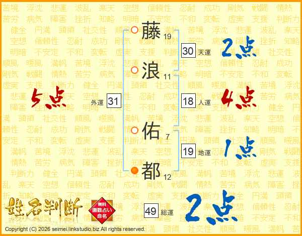 藤(19画)浪(11画) 佑(7画)都(12画)