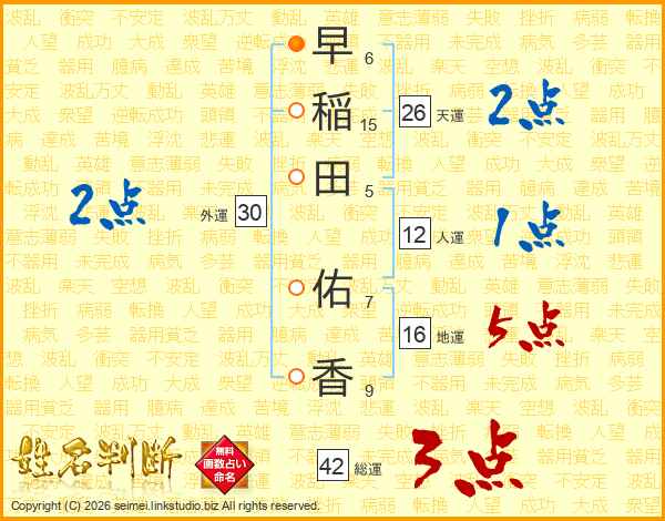 早(6画)稲(15画)田(5画) 佑(7画)香(9画)