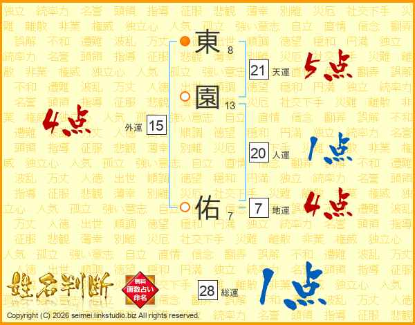 東(8画)園(13画) 佑(7画)
