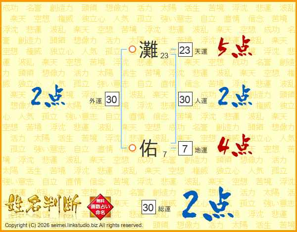 家系が持つ宿命的な運勢を表します。祖先から受け継いだ苗字ですので自分の力が及びません。家柄を象徴します。苗字の合計画数。