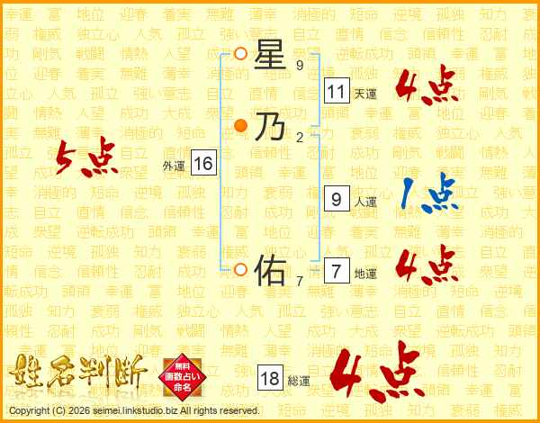 生活面を象徴する運勢です。外部から受ける影響力を表し、結婚運、家庭運や職場、環境への順応性を表します。総運から人運を引いた画数。姓や名が1文字の場合を除く。