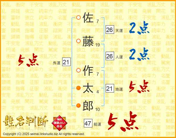 佐(7画)藤(19画) 作(7画)太(4画)郎(10画)