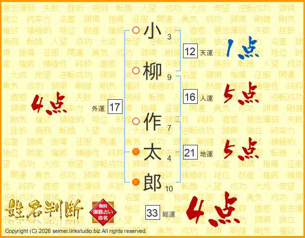 小(3画)柳(9画) 作(7画)太(4画)郎(10画)