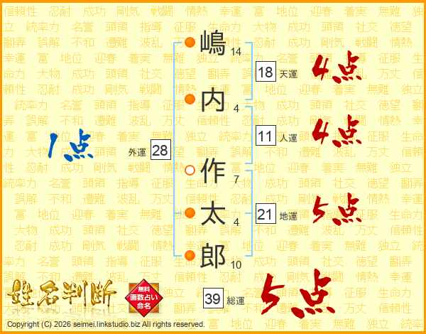 嶋(14画)内(4画) 作(7画)太(4画)郎(10画)