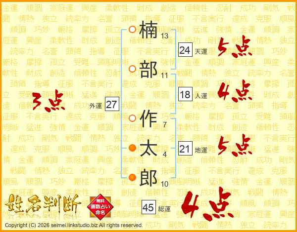 楠(13画)部(11画) 作(7画)太(4画)郎(10画)