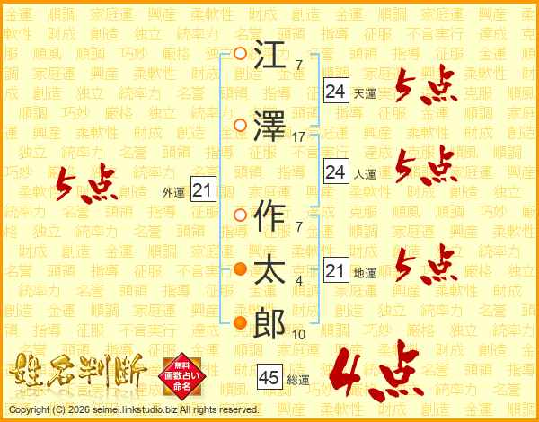 江(7画)澤(17画) 作(7画)太(4画)郎(10画)
