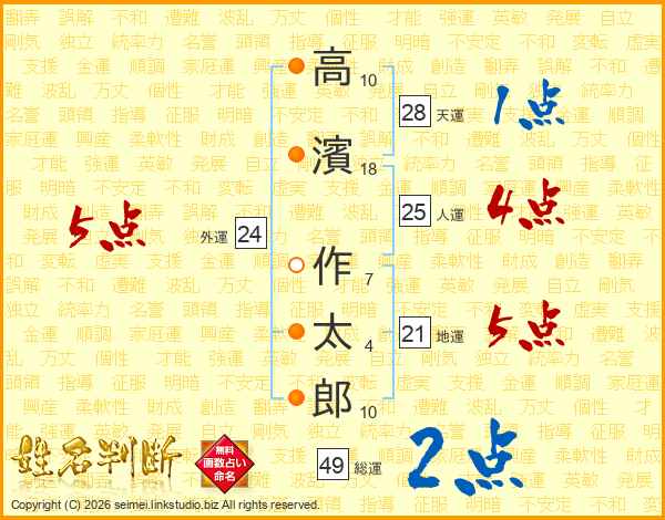 高(10画)濱(18画) 作(7画)太(4画)郎(10画)