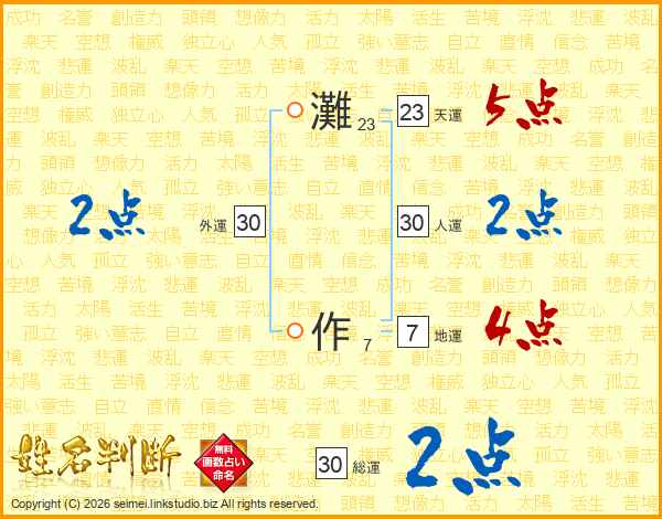 生活面を象徴する運勢です。外部から受ける影響力を表し、結婚運、家庭運や職場、環境への順応性を表します。総運から人運を引いた画数。姓や名が1文字の場合を除く。