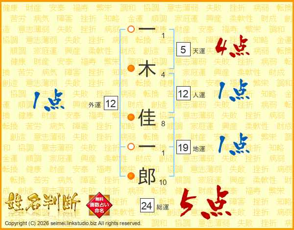 一(1画)木(4画) 佳(8画)一(1画)郎(10画)
