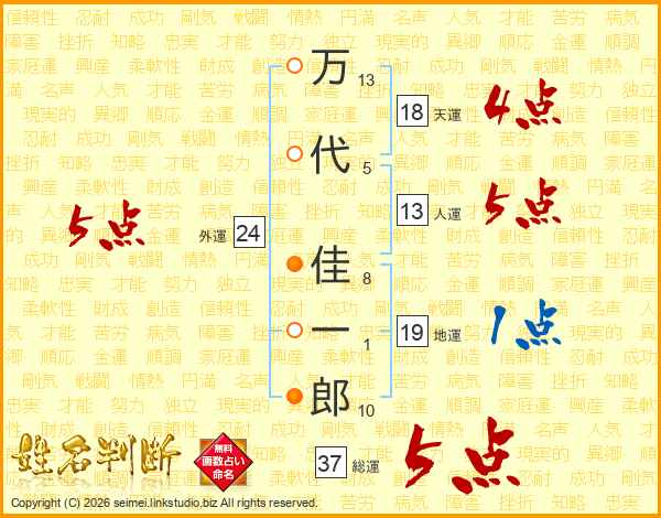 万代佳一郎さんの総運は37画の5点!