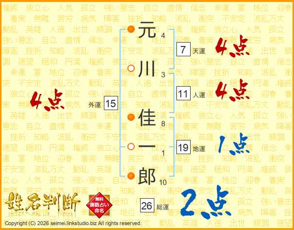 元(4画)川(3画) 佳(8画)一(1画)郎(10画)