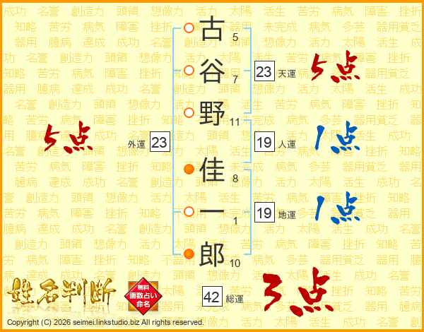 古(5画)谷(7画)野(11画) 佳(8画)一(1画)郎(10画)