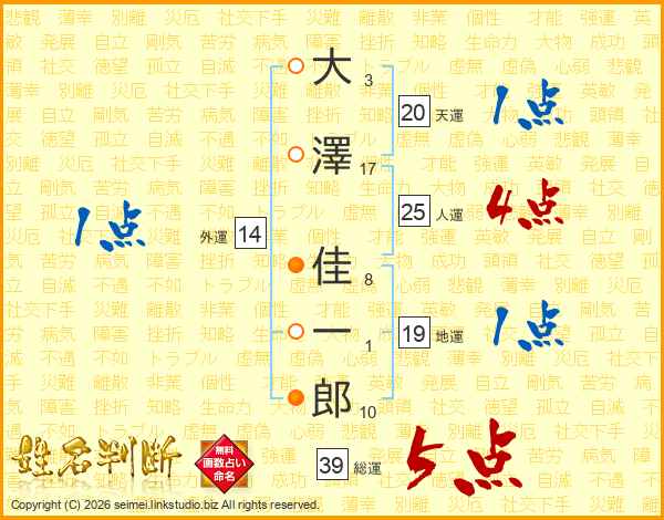 大(3画)澤(17画) 佳(8画)一(1画)郎(10画)