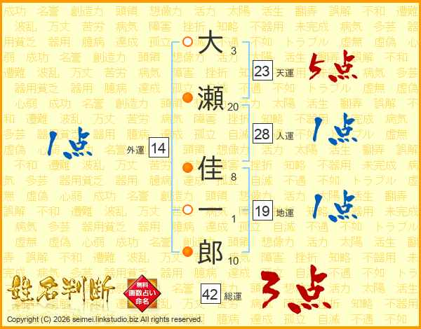 大(3画)瀬(20画) 佳(8画)一(1画)郎(10画)
