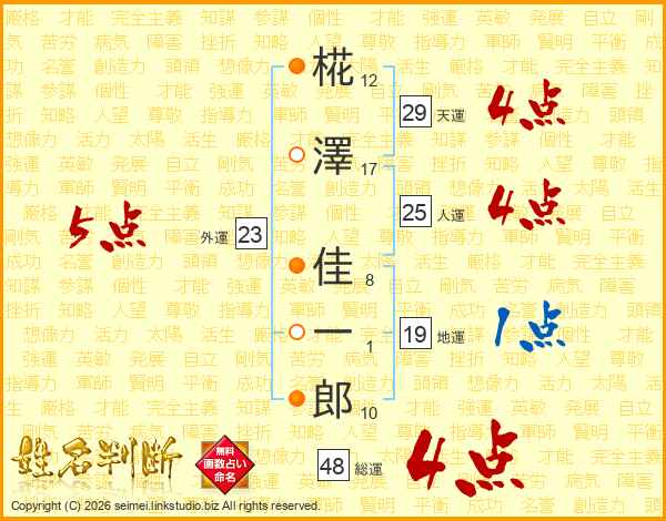 椛澤佳一郎さんの天運は29画の4点!