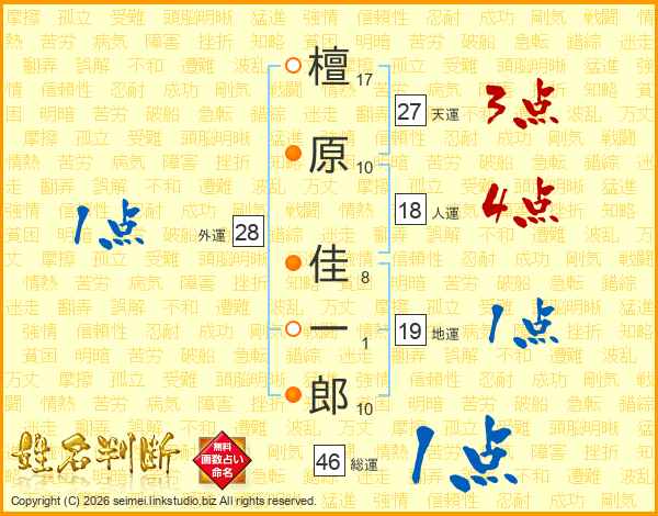 檀(17画)原(10画) 佳(8画)一(1画)郎(10画)
