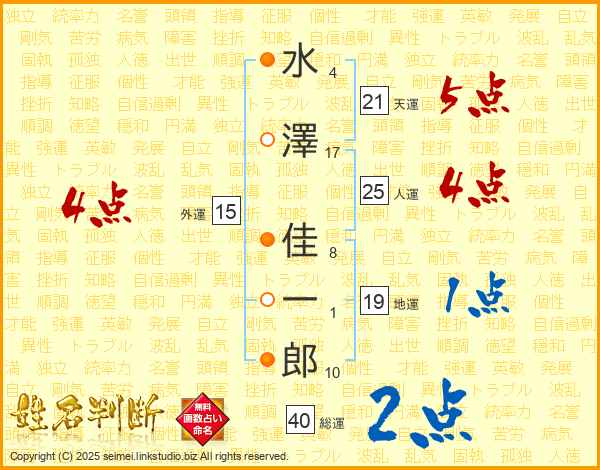 水(4画)澤(17画) 佳(8画)一(1画)郎(10画)