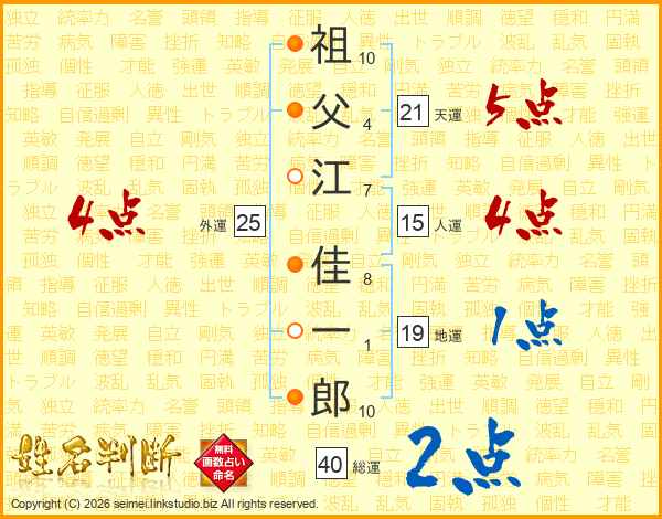 祖(10画)父(4画)江(7画) 佳(8画)一(1画)郎(10画)