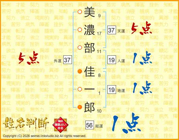 美(9画)濃(17画)部(11画) 佳(8画)一(1画)郎(10画)