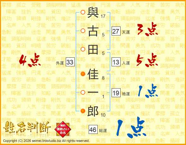 與(17画)古(5画)田(5画) 佳(8画)一(1画)郎(10画)