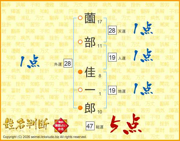薗(17画)部(11画) 佳(8画)一(1画)郎(10画)