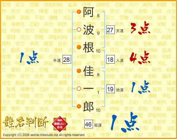 阿(8画)波(9画)根(10画) 佳(8画)一(1画)郎(10画)