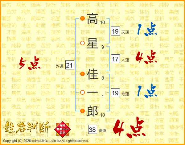 高(10画)星(9画) 佳(8画)一(1画)郎(10画)