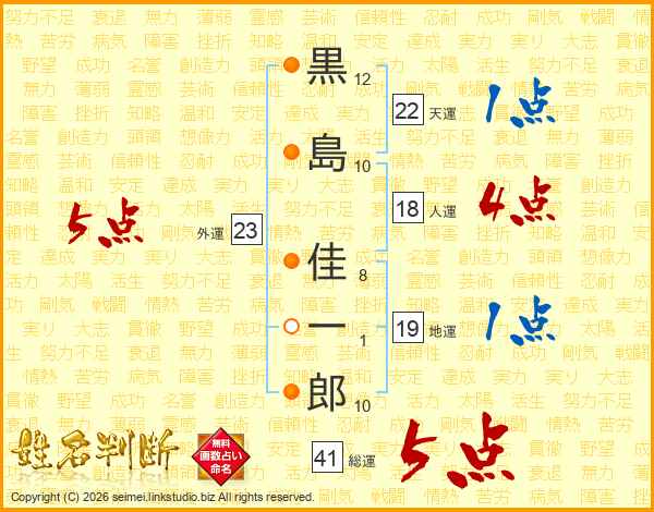 黒(12画)島(10画) 佳(8画)一(1画)郎(10画)