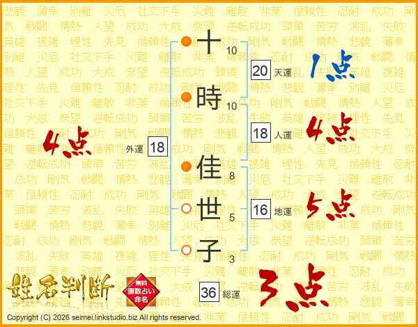十(10画)時(10画) 佳(8画)世(5画)子(3画)