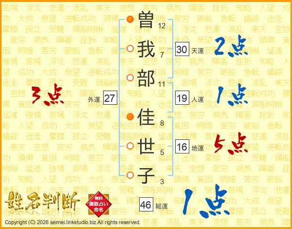 曽(12画)我(7画)部(11画) 佳(8画)世(5画)子(3画)