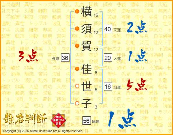 横(16画)須(12画)賀(12画) 佳(8画)世(5画)子(3画)