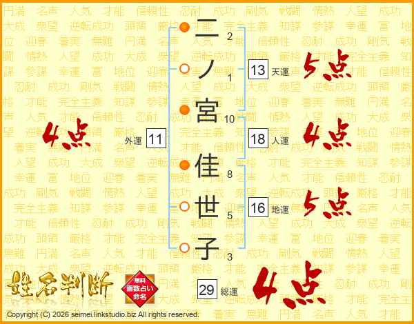 二(2画)ノ(1画)宮(10画) 佳(8画)世(5画)子(3画)