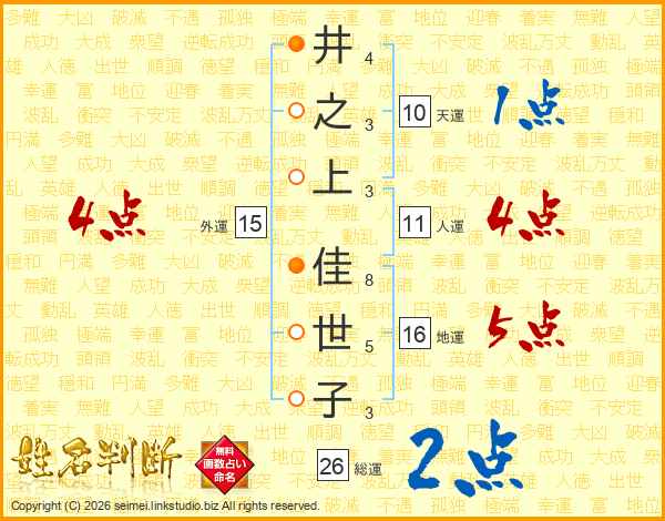 井(4画)之(3画)上(3画) 佳(8画)世(5画)子(3画)