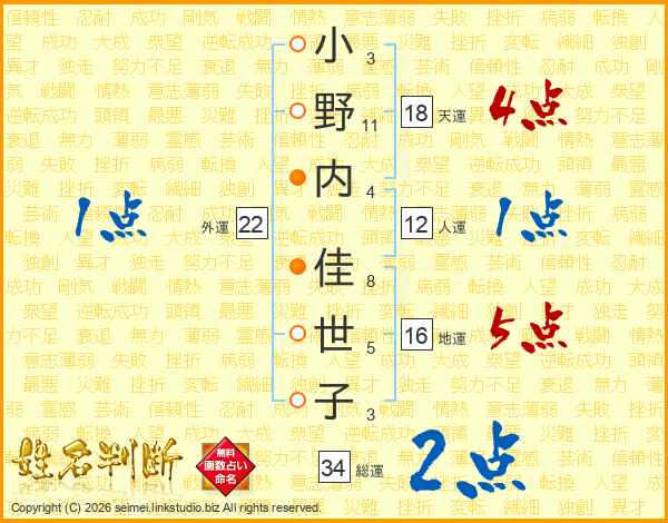 小(3画)野(11画)内(4画) 佳(8画)世(5画)子(3画)