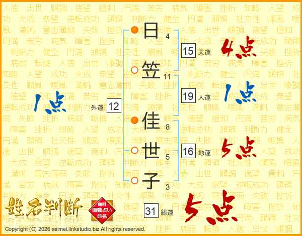 日(4画)笠(11画) 佳(8画)世(5画)子(3画)