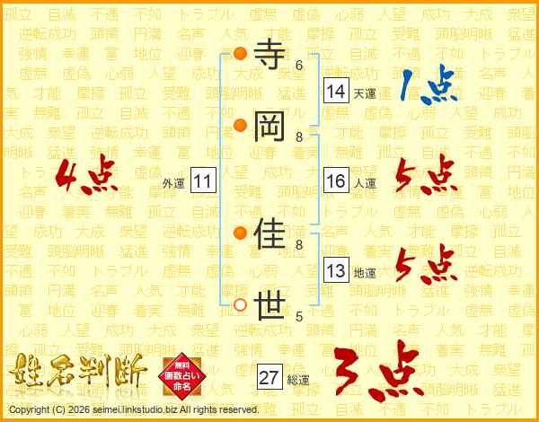 寺(6画)岡(8画) 佳(8画)世(5画)