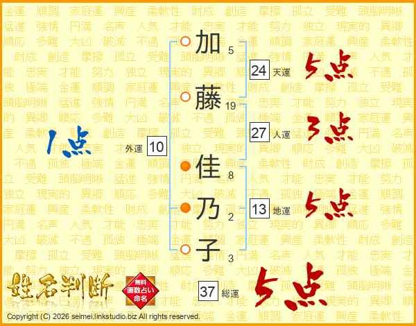 加(5画)藤(19画) 佳(8画)乃(2画)子(3画)