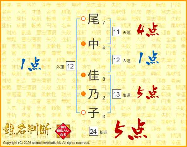 尾(7画)中(4画) 佳(8画)乃(2画)子(3画)