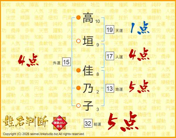 高(10画)垣(9画) 佳(8画)乃(2画)子(3画)