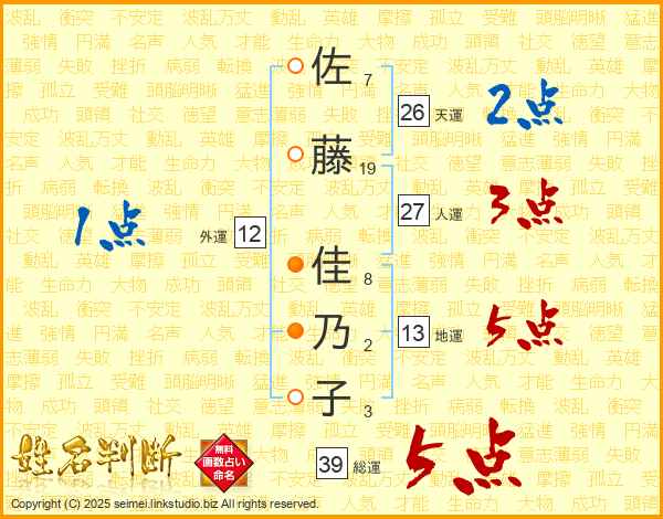 佐(7画)藤(19画)  佳(8画)乃(2画)子(3画)