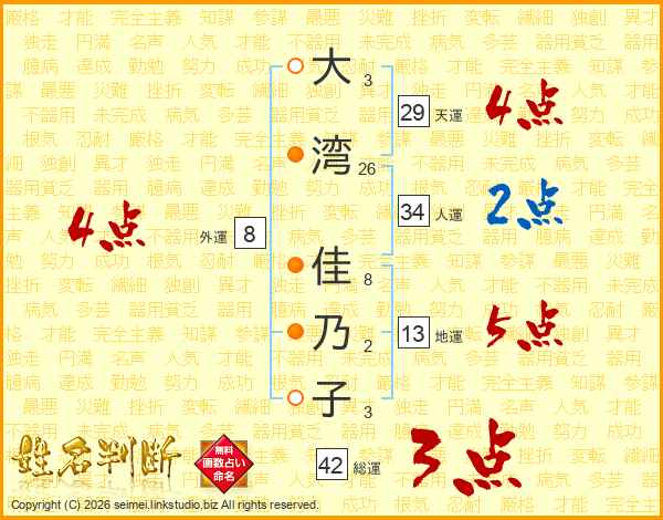大(3画)湾(26画) 佳(8画)乃(2画)子(3画)