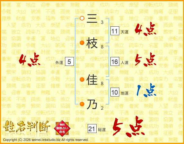 あなたの人生を表す1番重要な運勢です。生涯を通じて影響する総合運となり、主に50歳以降の晩年期に影響を及ぼします。苗字と名前の合計画数。