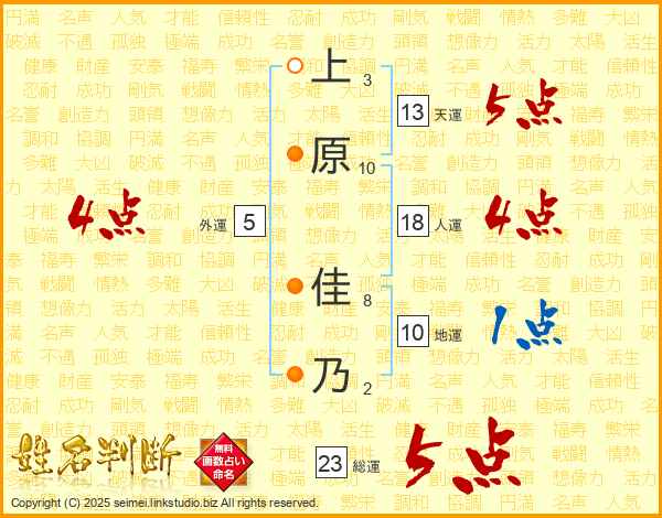 生活面を象徴する運勢です。外部から受ける影響力を表し、結婚運、家庭運や職場、環境への順応性を表します。総運から人運を引いた画数。姓や名が1文字の場合を除く。