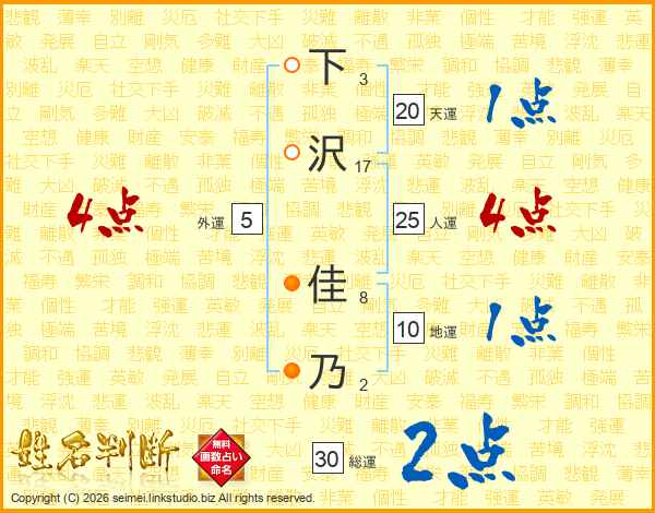 下(3画)沢(17画) 佳(8画)乃(2画)