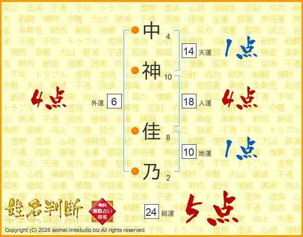 生活面を象徴する運勢です。外部から受ける影響力を表し、結婚運、家庭運や職場、環境への順応性を表します。総運から人運を引いた画数。姓や名が1文字の場合を除く。