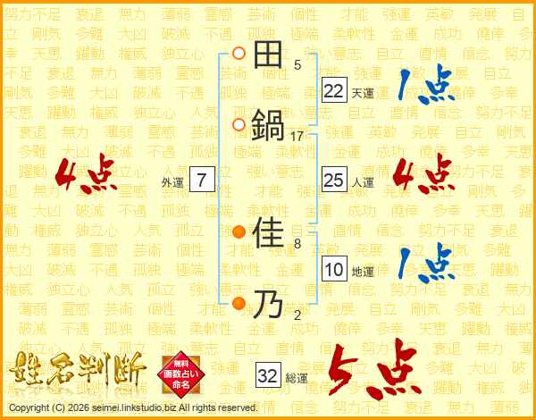 田(5画)鍋(17画) 佳(8画)乃(2画)