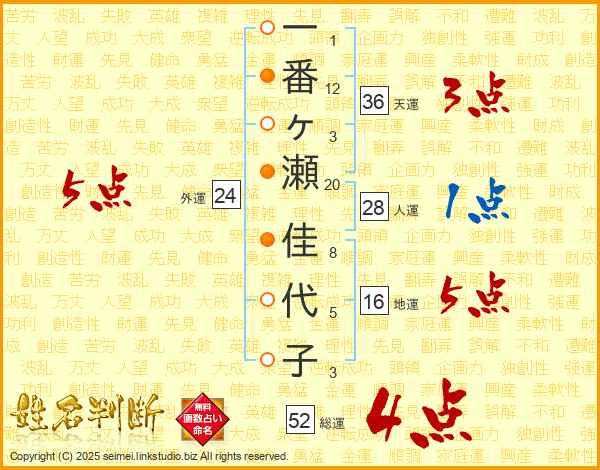 一番ヶ瀬佳代子さんの総運は52画の4点!
