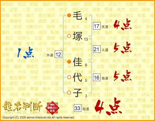 毛(4画)塚(13画) 佳(8画)代(5画)子(3画)